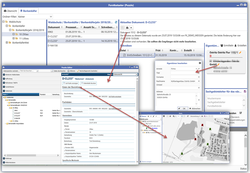 Besonderes Augenmerk gilt der Kategorie Waldschutz, welche insbesondere für die Erfassung der Borkenkäferherde, Kalamitäten und zum Waldschutz Monitoring entwickelt wurde. Hier kann die Waldschutzmeldung, welche eine Übersicht der betroffenen und beräumten Gebiete im Landkreis zeigt, erstellt werden. Außerdem wurde auf Grundlage der Kategorie Waldschutz, speziell für die Kategorie Borkenkäfer, die Serienbriefanwendung Forstkataster erstellt. Mittels dieser Anwendung können verschiedene Anschreiben, entsprechend der hinterlegten Vorlage, in einer festgelegten Reihenfolge an die Waldbesitzer erstellt werden. Die Waldbesitzer werden automatisch auf Knopfdruck, unter Beachtung des Datenschutzes, aus den Grundbuchdaten ermittelt. Der Empfänger des Schreibens kann dann direkt ausgewählt werden. Da in Sachsen keine Anredeinformationen mehr mitgespeichert werden können, ist es ebenfalls möglich, die Adressdaten nochmal speziell zu bearbeiten.